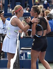 Открытый чемпионат США (US Open) по теннису. Российская теннисистка Анастасия Павлюченкова (слева) и французская теннисистка Полин Пармантье (справа) после окончания матча.