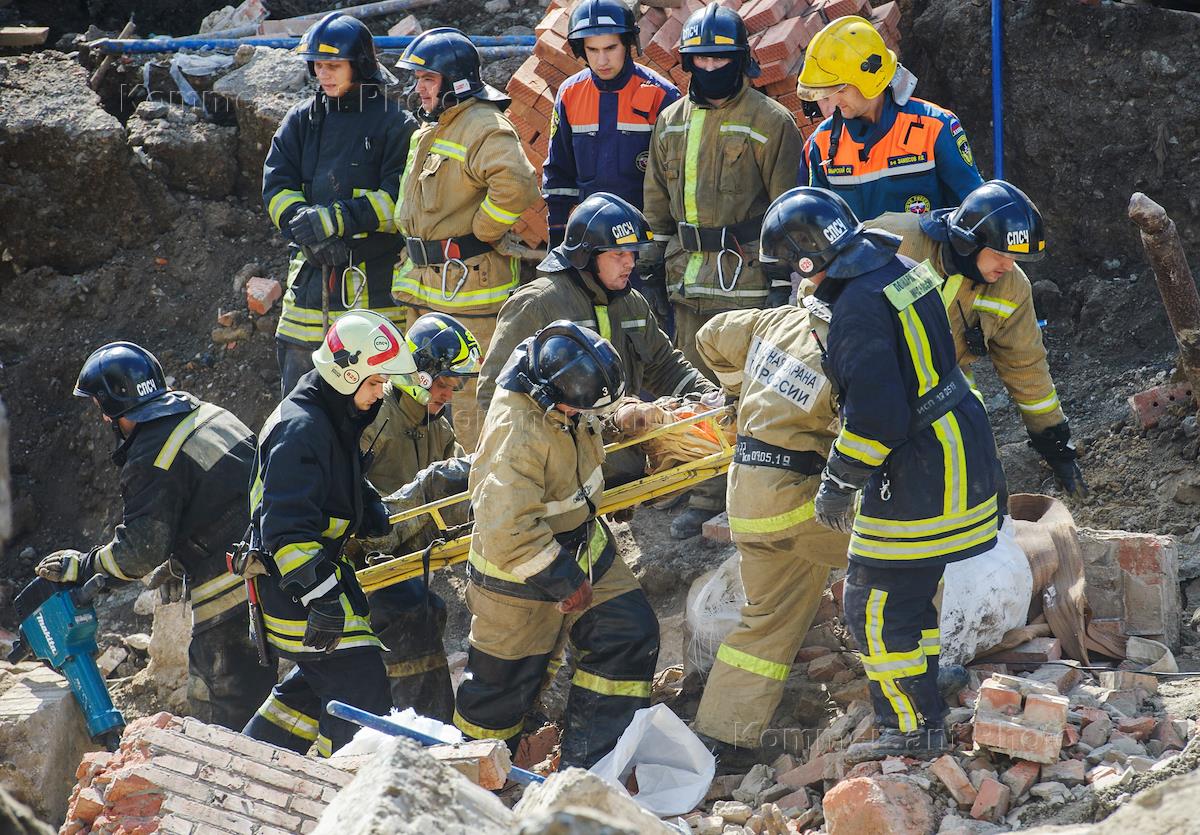 First responders at the site of collapsed wall and ceiling of an office building under construction on Udarnaya Street.