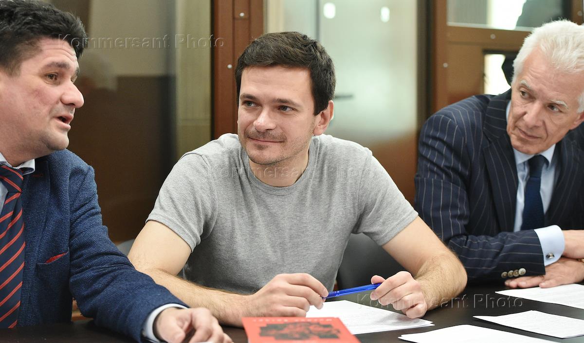 The election of a preventive measure to the unregistered candidate for deputy of the Moscow City Duma, Ilya Yashin, accused of calls for an uncoordinated rally on August 3, was held in the Tver District Court. From left to right: lawyer Vadim Prokhorov, unregistered candidate for deputy of the Moscow City Duma Ilya Yashin and lawyer Mikhail Biryukov during a court hearing.