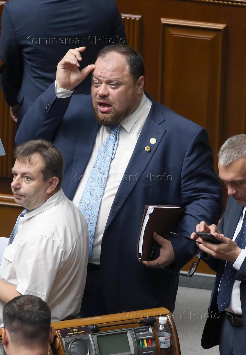 Первое заседание Верховной Рады Украины (ВРУ) IX созыва и принятия присяги новоизбранными народными депутатами. Представитель главы государства в ВРУ Руслан Стефанчук (в центре) и председатель ВРУ Дмитрий Разумков (справа) во время заседания.
