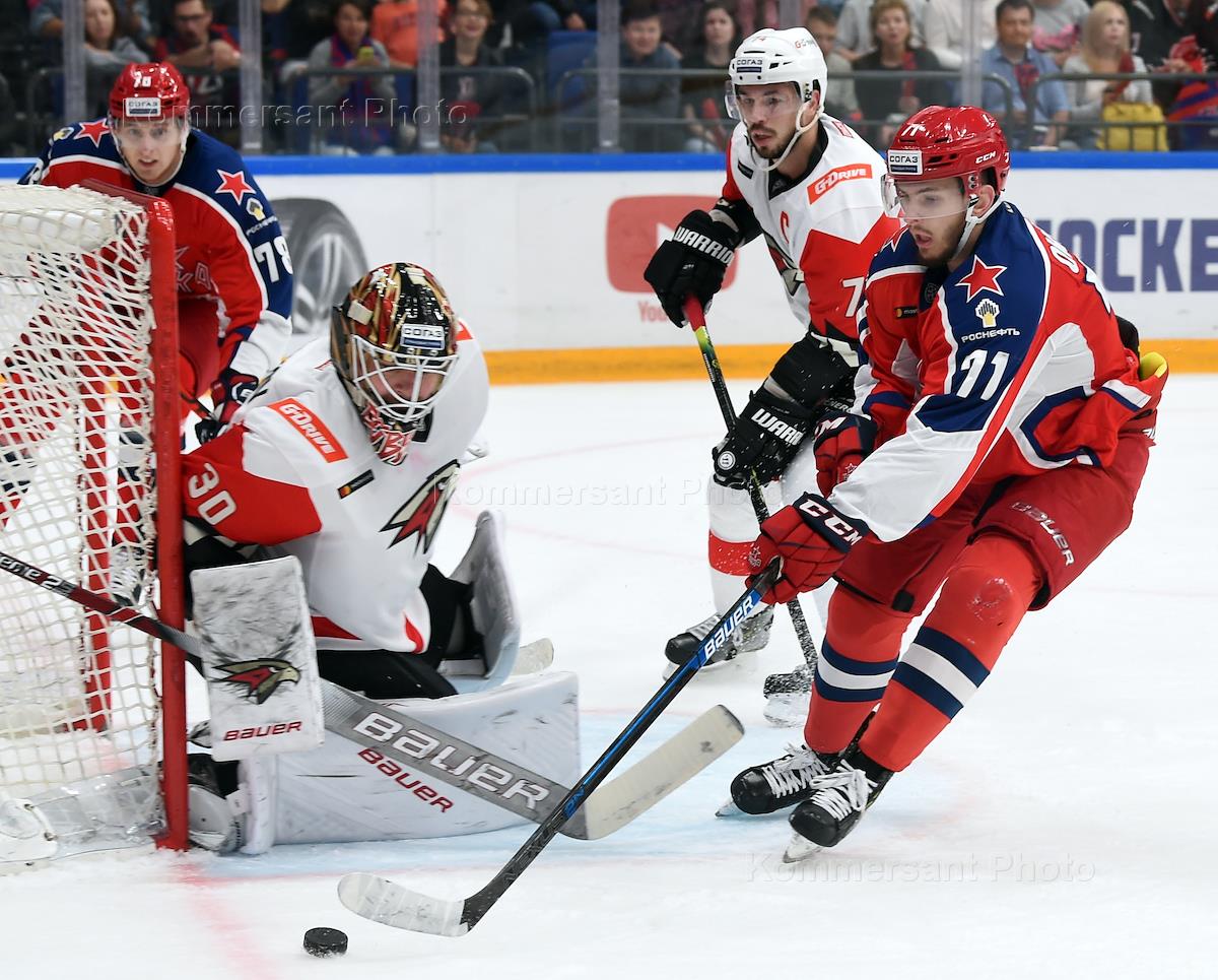 Континентальная хоккейная лига (КХЛ). 2019/2020. Матч между командами ЦСКА (Москва) и "Авангард" (Омск) на стадионе на стадионе "ЦСКА-Арена". Вратарь команды "Авангард" Игорь Бобков (в центре) во время матча.