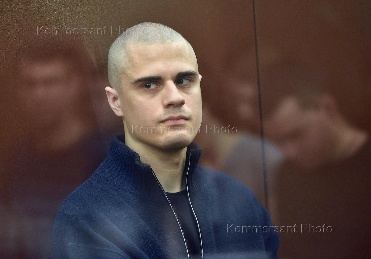 Обвиняемый по уголовному делу о массовых беспорядках в Москве 27 июля 2019 за допуск независимых кандидатов на выборы в Московскую городскую думу Иван Подкопаев во время заседания Тверского районного суда.