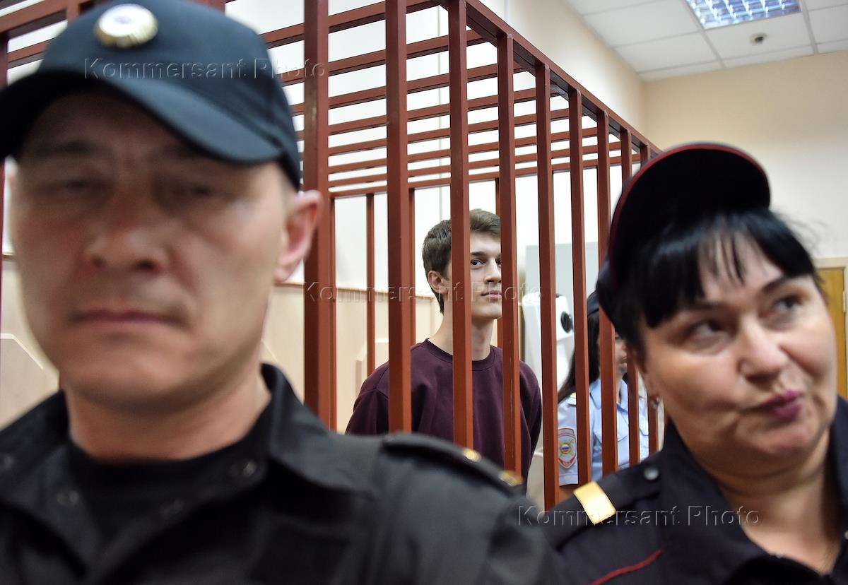 Студент четвертого курса факультета "Социальных наук" Высшей школы экономики и видеоблогер Егор Жуков (в центре), обвиняемый по делу о массовых беспорядках на акции 27 июля, во время заседания Басманного районного суда.