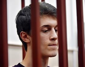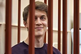 Студент четвертого курса факультета "Социальных наук" Высшей школы экономики и видеоблогер Егор Жуков (в центре), обвиняемый по делу о массовых беспорядках на акции 27 июля, во время заседания Басманного районного суда.