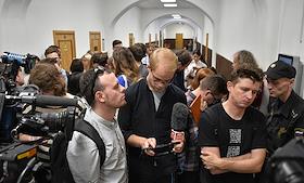Представители СМИ в коридоре Басманного районного суда во время заседания суда по делу студента четвертого курса факультета "Социальных наук" Высшей школы экономики и видеоблогер Егора Жукова, обвиняемого по делу о массовых беспорядках на акции 27 июля.