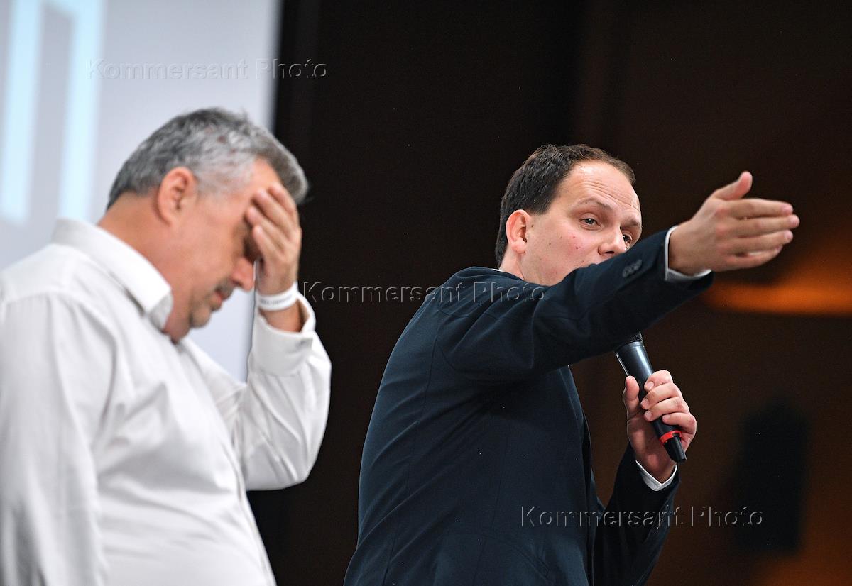 Премьера фильма "Сорокин Трип" в Центре документального кино. Актер Максим Виторган (слева) и журналист Антон Желнов (справа) на премьере.
