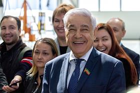 Председатель Госсовета Республики Татарстан Фарид Мухаметшин (в центре) во время встречи с трудовым коллективом завода КАЗ им. С.П.Горбунова - филиала ПАО "Туполев".