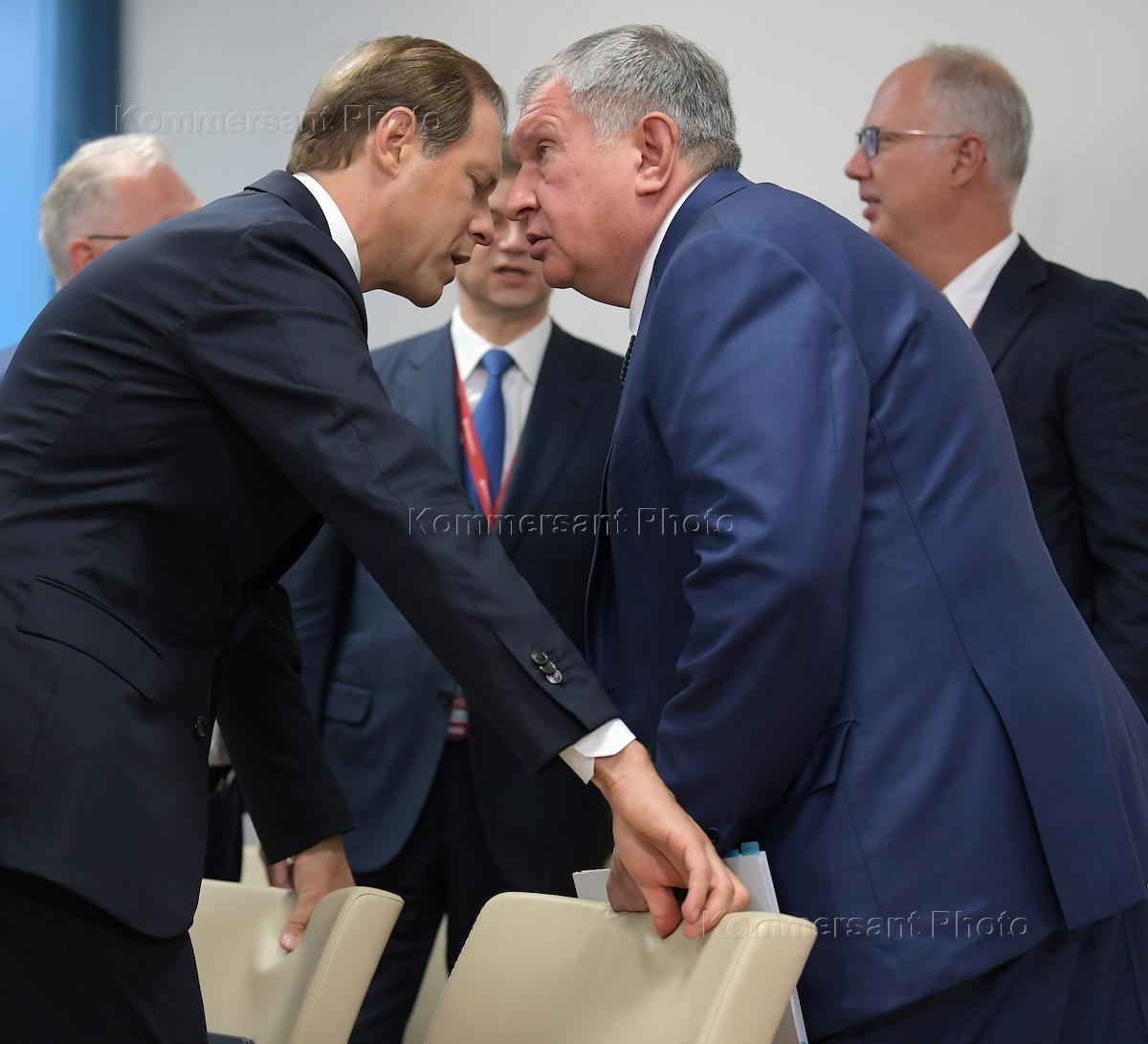 Рабочая поездка президента России Владимира Путина во Владивосток. V Восточный экономический форум (ВЭФ). Справа налево: генеральный директор Российского фонда прямых инвестиций (РФПИ) Кирилл Дмитриев, председатель правления ОАО "НК "Роснефть" Игорь Сечин, генеральный директор - председатель правления ОАО "РЖД" Олег Белозеров и министр промышленности и торговли России Денис Мантуров перед встречей президента России Владимира Путина и премьер-министра Малайзии Махатхира Мохамада в рамках V Восточного экономического форума в Международном пресс-центре на территории Дальневосточного федерального университета (ДВФУ) на острове Русский.