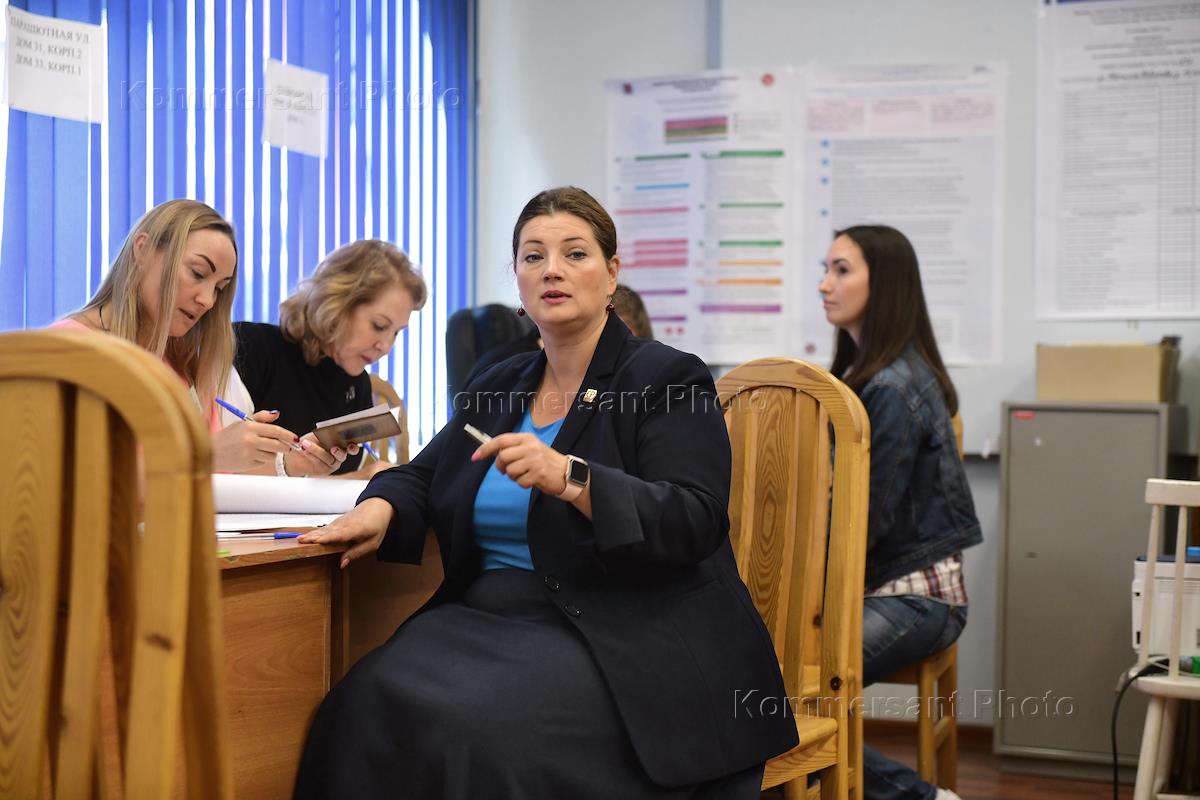 Единый день голосования. Выборы губернатора Санкт-Петербурга и выборы депутатов Муниципальных Советов муниципальных образований города Санкт-Петербург. Кандидат в губернаторы Санкт-Петербурга Надежда Тихонова (в центре) во время голосования на избирательном участке.