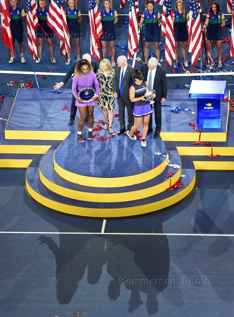 Открытый чемпионат США (US Open) 2019 по теннису. Финал. Женщины. Канадская теннисистка Бьянка Андрееску (вторая справа) во время церемонии награждения после окончания матча с американской теннисисткой Сереной Уильямс (слева).