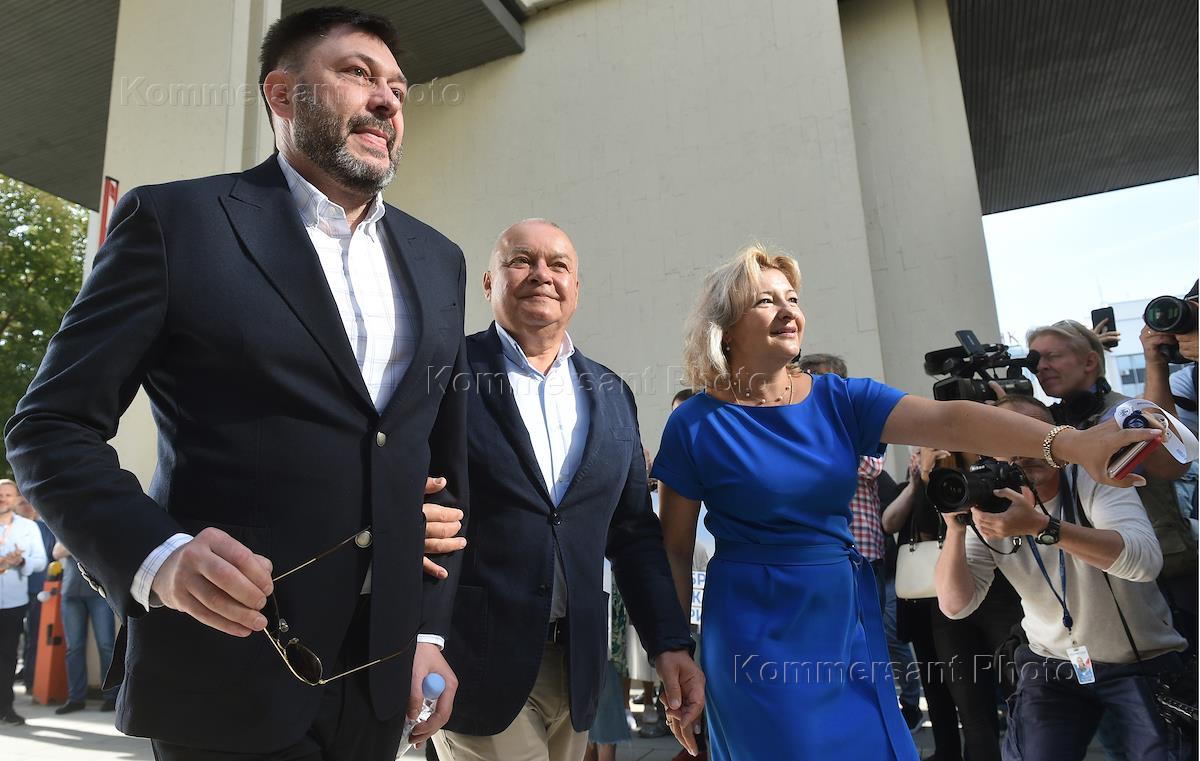 Главный редактор информационного портала "РИА Новости Украина" Кирилл Вышинский (справа) и генеральный директор информационного агентства "Россия сегодня" Дмитрий Киселев (в центре) перед началом пресс-конференции в пресс-центре МИА "Россия сегодня".