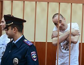 Обвиняемые по ч. 2 ст. 205.4 УК РФ "Организация террористического сообщества и участие в нем" Юлий Бояршинов (второй слева) и Виктор Филинков (справа) во время заседания Московского окружного военного суда в помещении 224-го гарнизонного военного суда.