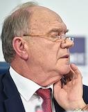 Пресс-конференция руководства партии КПРФ об итогах Единого дня голосования в ТАСС. Лидер КПРФ, член комитета Государственной думы России по делам Содружества Независимых Государств, евразийской интеграции и связям с соотечественниками Геннадий Зюганов (в центре) перед началом пресс-конференции.