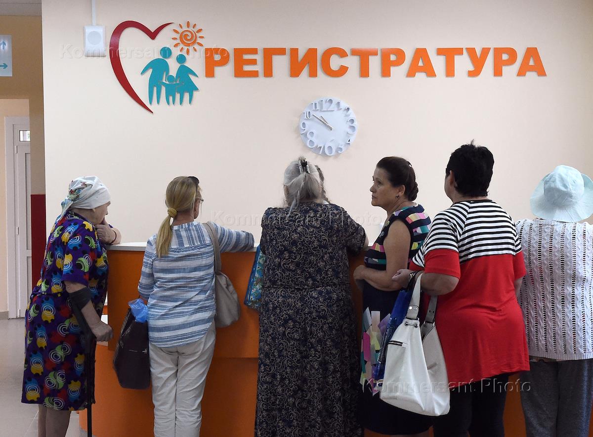 Работа городской поликлиники. Прививка населения против гриппа. Пациенты в очереди в регистратуру.
