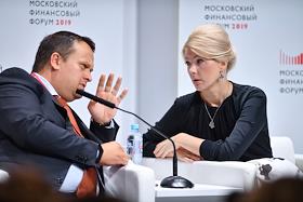 Московский финансовый форум 2019 в Центральном выставочном зале "Манеж". Губернатор Новгородской области Андрей Никитин (слева) и заместитель министра просвещения России Мария Ракова (справа) во время форума.