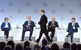 Московский финансовый форум 2019 в Центральном выставочном зале "Манеж". Слева направо: председатель Центрального Банка России Эльвира Набиуллина, мэр Москвы Сергей Собянин, председатель Правительства России Дмитрий Медведев, первый заместитель председателя правительства России - министр финансов России Антон Силуанов и министр экономического развития России Максим Орешкин во время работы форума.