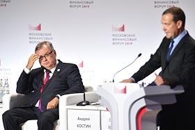 Московский финансовый форум 2019 в Центральном выставочном зале "Манеж". Председатель Правительства России Дмитрий Медведев (справа) и президент, председатель правления ПАО "Банк ВТБ" Андрей Костин (слева) во время работы форума.