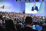 Московский финансовый форум 2019 в Центральном выставочном зале "Манеж". Выступление председателя Правительства России Дмитрия Медведева (на экране) на форуме.