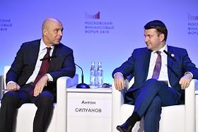 Московский финансовый форум 2019 в Центральном выставочном зале "Манеж". Мэр Москвы Сергей Собянин (слева) и первый заместитель председателя Правительства России - министр финансов России Антон Силуанов (справа) во время работы форума.