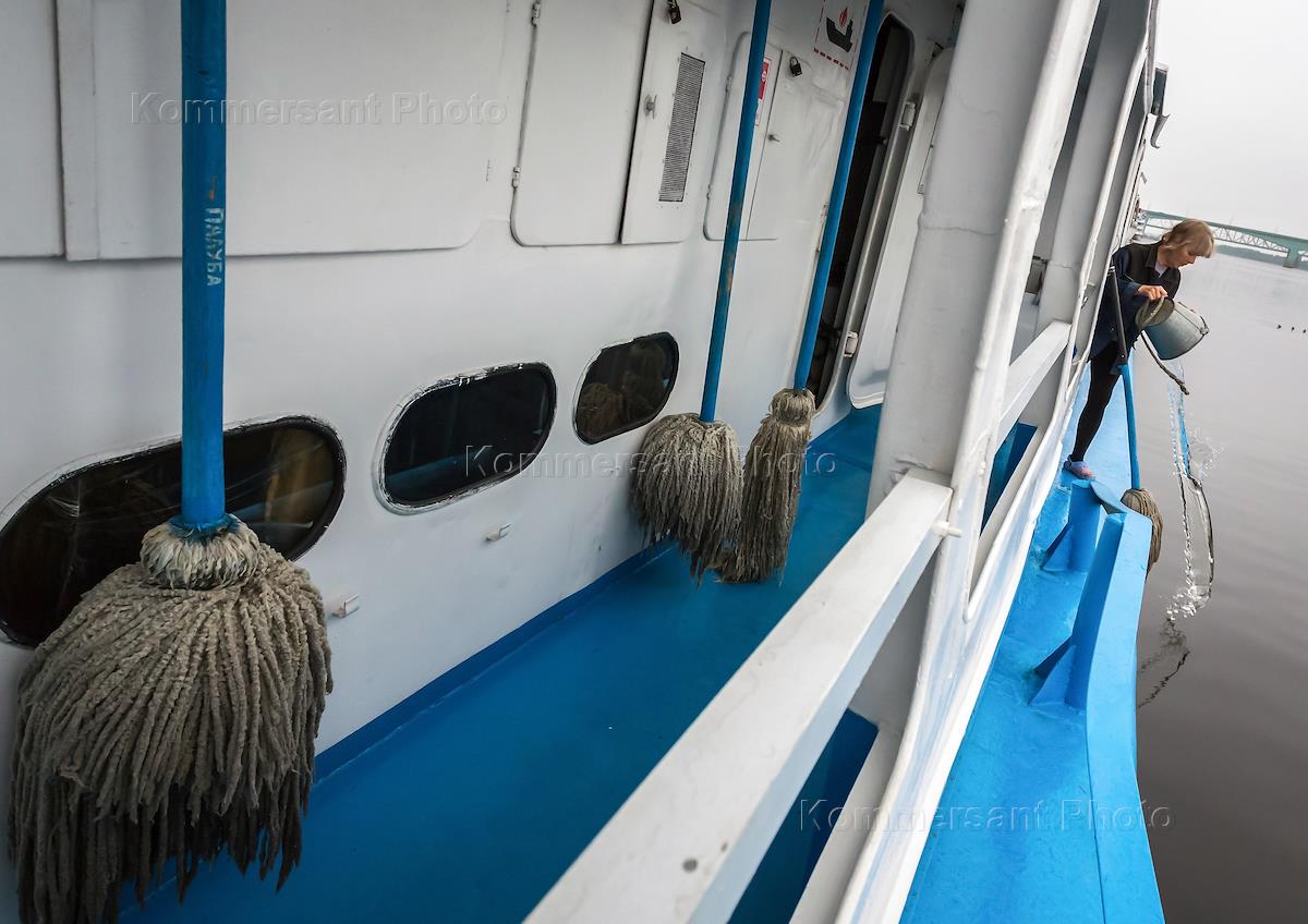 Капитан теплохода "Москва - 182" Марина Гаврилова во время уборки теплохода перед сдачей утренней вахты другому экипажу.