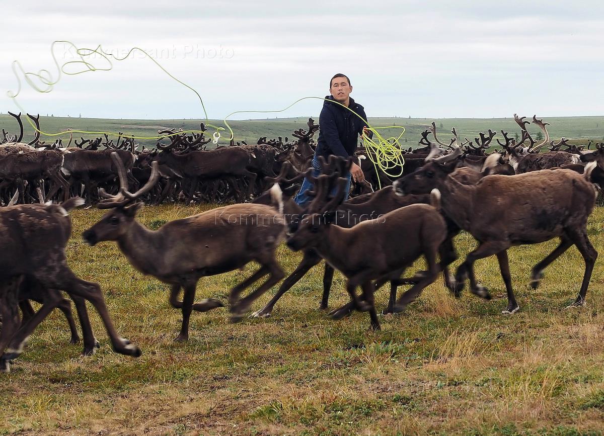 Стойбище оленеводов-хантов в тундре. Оленевод ловит оленей арканом (лассо).