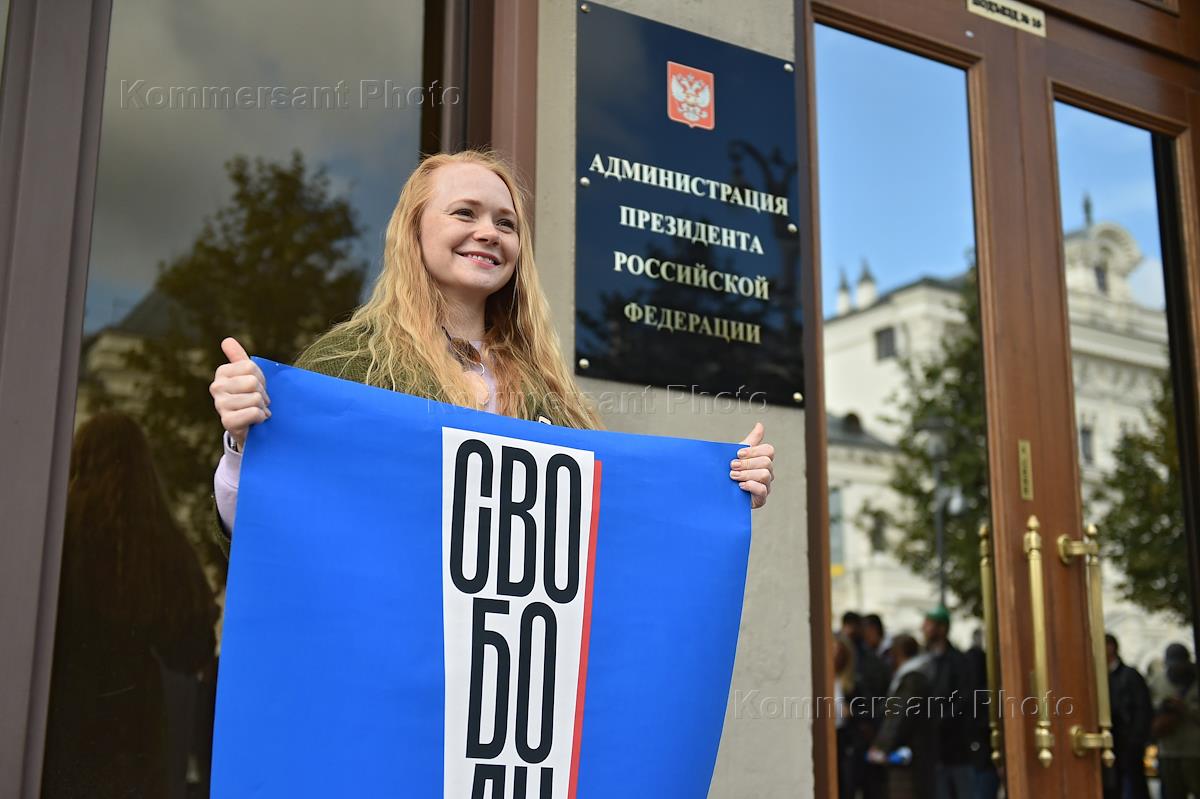 Одиночные пикеты в поддержку, актера, обвиняемого в нападении на бойца ОМОН в ходе несанкционированной акции протеста 3 августа 2019 года Павла Устинова у здания Администрации президента России. Актриса Софья Володчинская на пикете.