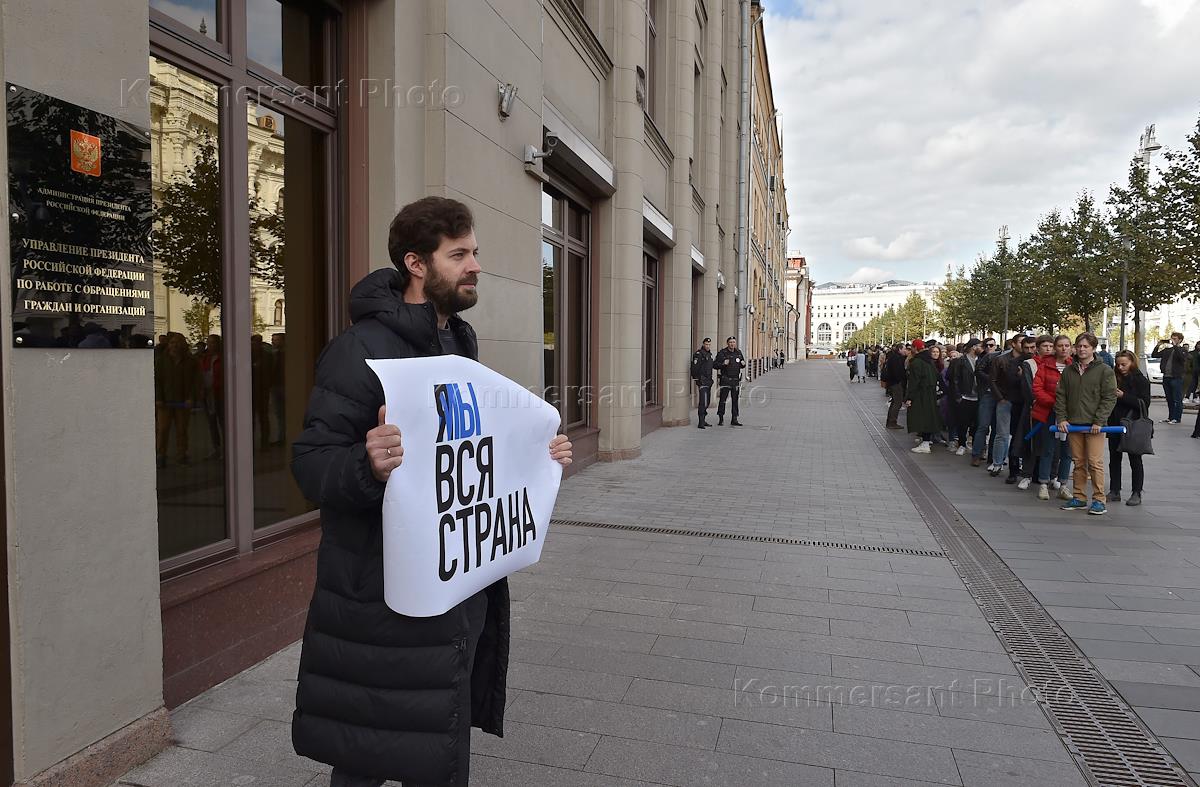 Одиночные пикеты в поддержку, актера Павла Устинова, обвиняемого в нападении на бойца ОМОН в ходе несанкционированной акции протеста 3 августа 2019 года, у здания Администрации президента России. Очередь в пикет.