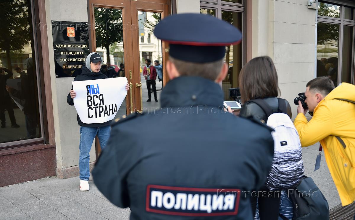 Одиночные пикеты в поддержку, актера Павла Устинова, обвиняемого в нападении на бойца ОМОН в ходе несанкционированной акции протеста 3 августа 2019 года, у здания Администрации президента России.
