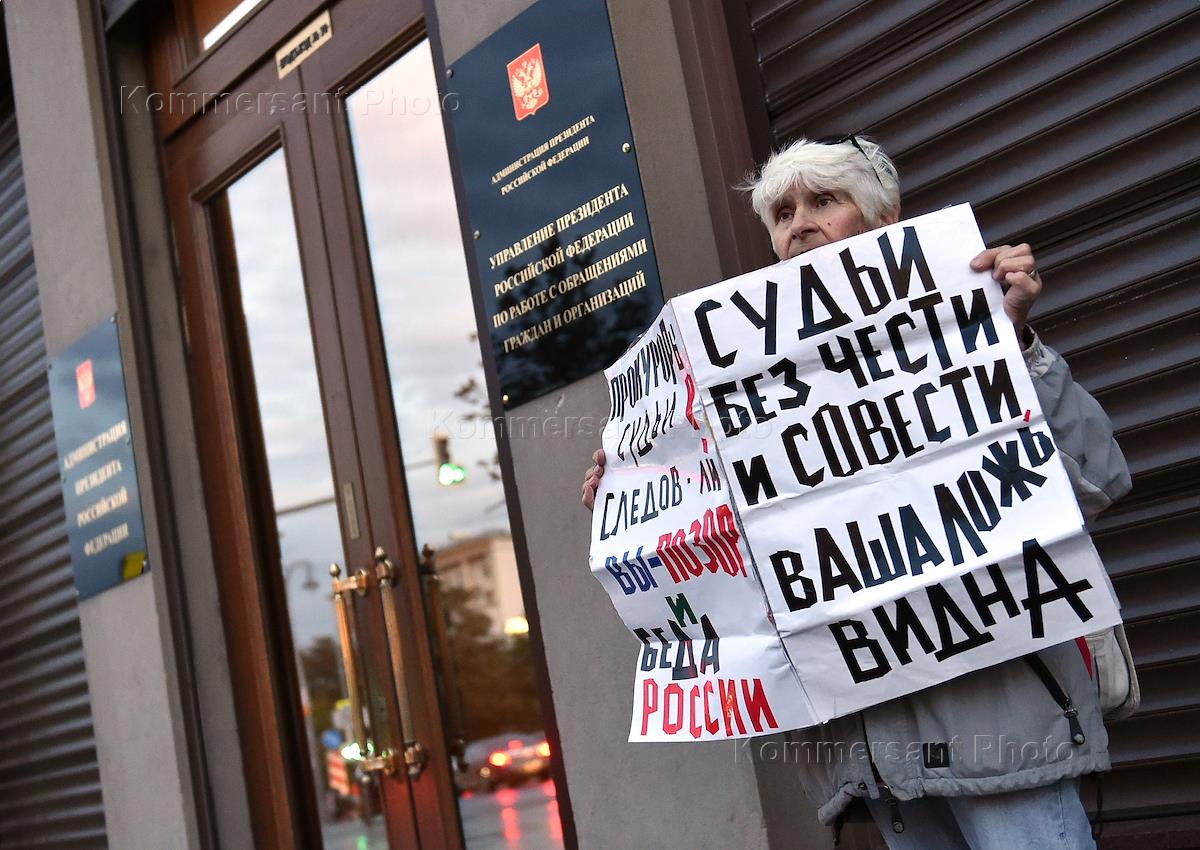 Одиночные пикеты в поддержку, актера Павла Устинова, обвиняемого в нападении на бойца ОМОН в ходе несанкционированной акции протеста 3 августа 2019 года, у здания Администрации президента России. Актриса Татьяна Догилева на пикете.