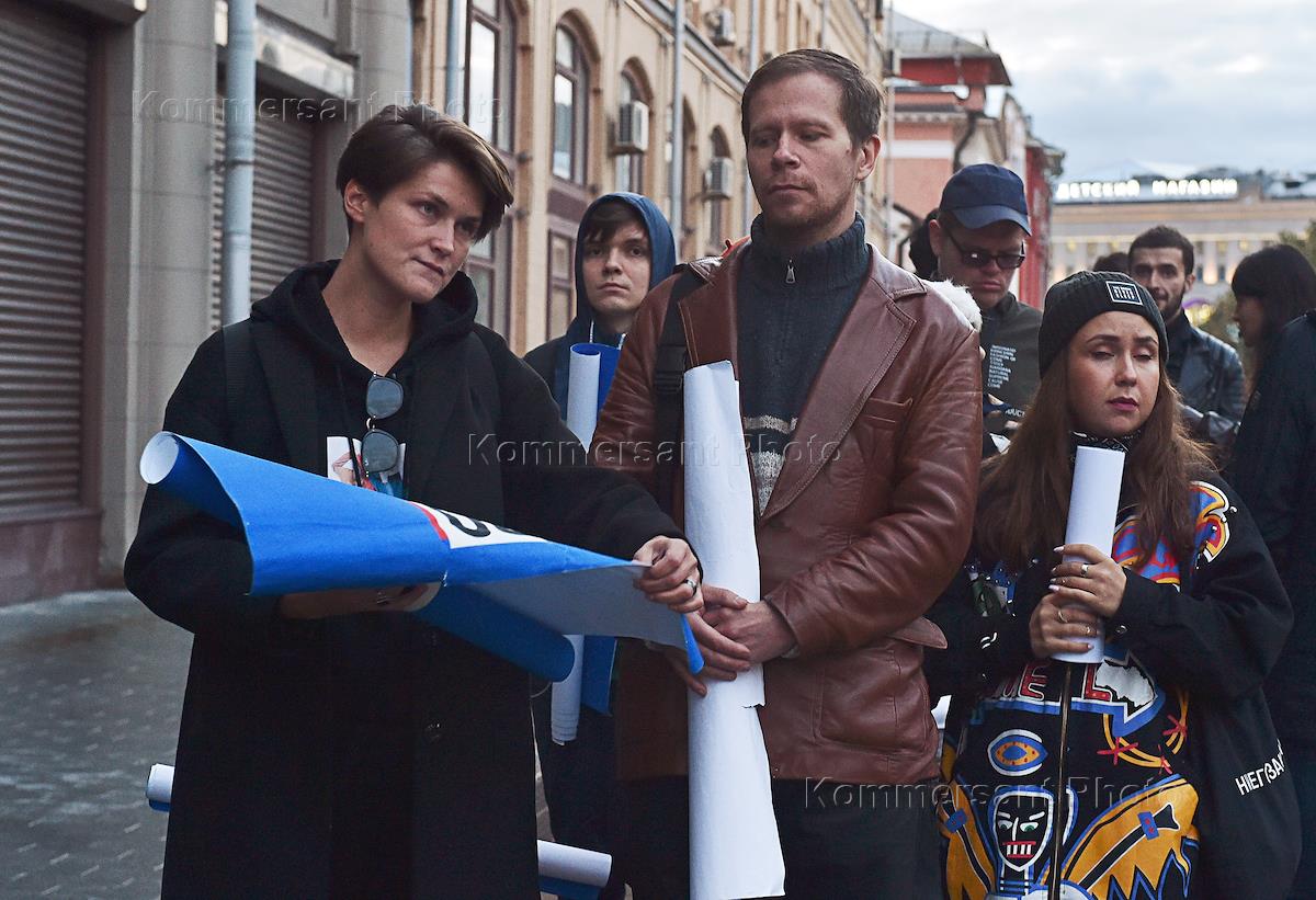 Одиночные пикеты в поддержку, актера, обвиняемого в нападении на бойца ОМОН в ходе несанкционированной акции протеста 3 августа 2019 года Павла Устинова у здания Администрации президента России. Певица Муся Тотибадзе (слева) и актер, режиссер Александр Молочников (в центре) во время пикета.