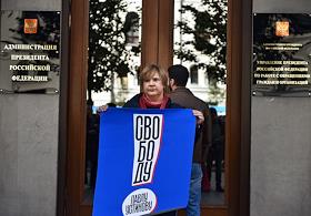 Одиночные пикеты в поддержку, актера Павла Устинова, обвиняемого в нападении на бойца ОМОН в ходе несанкционированной акции протеста 3 августа 2019 года, у здания Администрации президента России. Журналист Виктория Ивлева (в центре) на пикете.