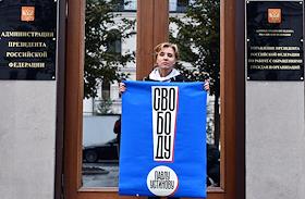 Одиночные пикеты в поддержку, актера, обвиняемого в нападении на бойца ОМОН в ходе несанкционированной акции протеста 3 августа 2019 года Павла Устинова у здания Администрации президента России. Музыкант, правозащитница Мария Алехина во время пикета.