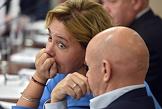 Заседание Общественного штаба по контролю и наблюдению за выборами по итогам проведения единого дня голосования прошло в Московском парламентском центре. Президент Московской торгово-промышленной палаты Владимир Платонов (справа) и телеведущая Арина Шарапова (слева) во время заседания.