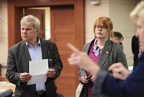 Первое заседание Московской городской думы VII созыва. Депутаты Мосгордумы Олег Шереметьев (слева) и Елена Шувалова (справа) перед началом заседания.