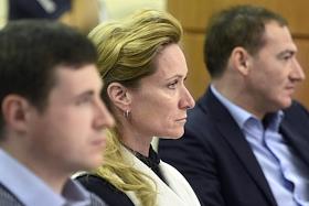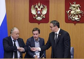 Первое заседание Московской городской думы VII созыва. Слева направо: депутаты Мосгордумы Олег Шереметьев, Михаил Тимонов и Елена Шувалова перед началом заседания.