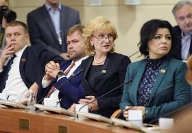 Первое заседание Московской городской думы VII созыва. Депутаты Мосгордумы Елена Шувалова (в центре) и Магомет Яндиев (справа) во время заседания.