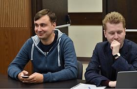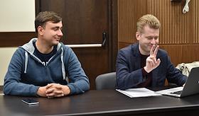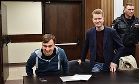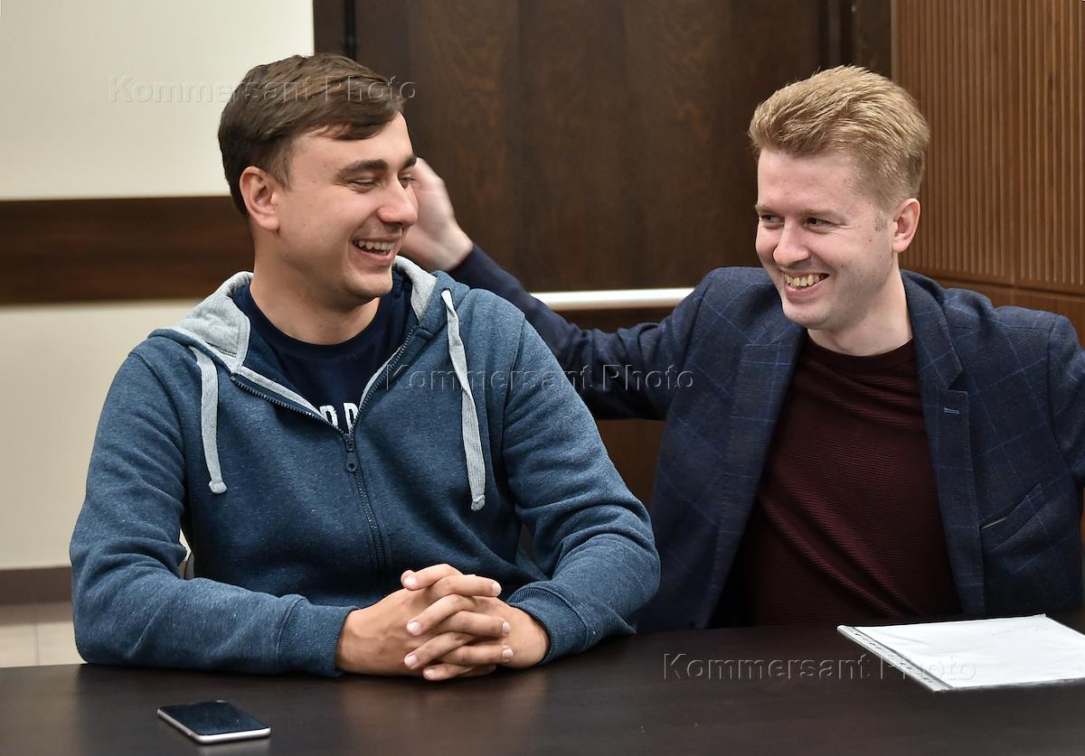 Директор Фонда борьбы с коррупцией (ФБК) Иван Жданов (слева), обвиняемый за призывы к участию в несанкционированной акции 27 июля 2019 в центре Москвы, во время заседания Мещанского районного суда.