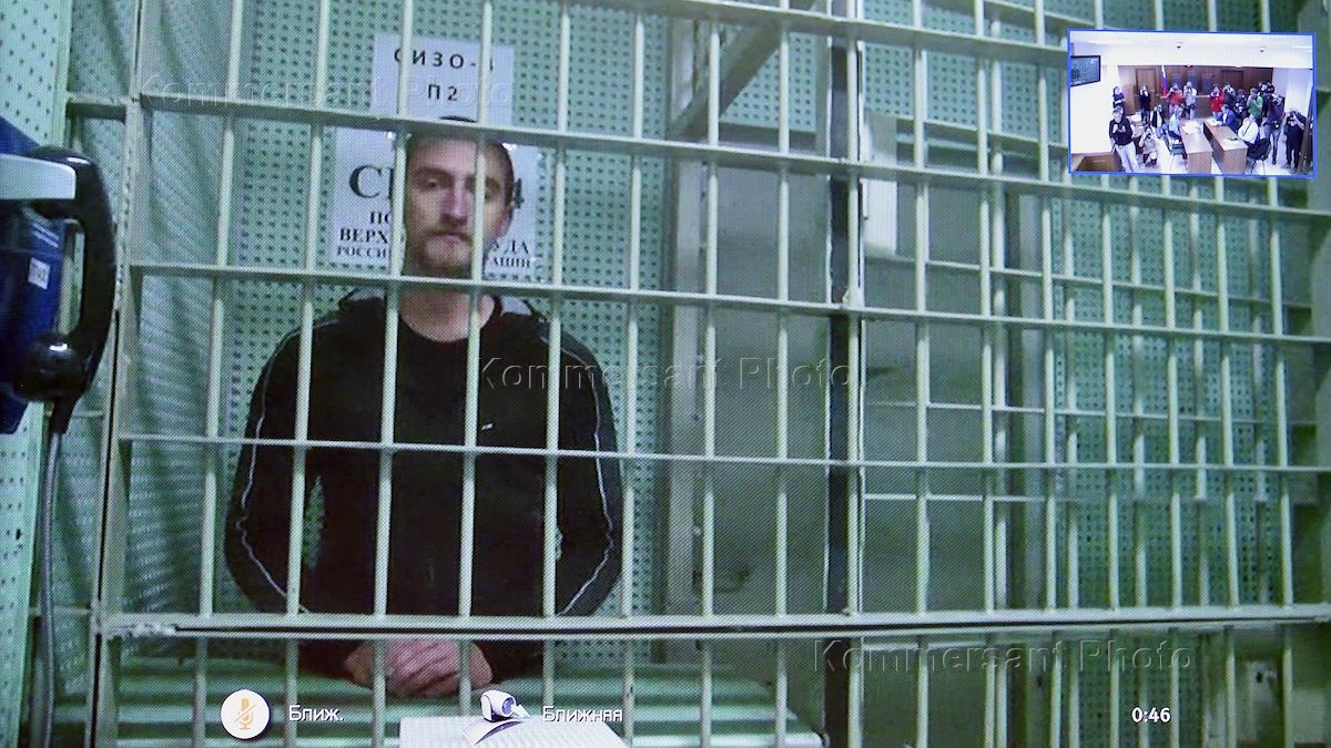 Рассмотрение ходатайства об изменении меры пресечения актеру Павлу Устинову, обвиняемому в нападении на бойца ОМОН в ходе несанкционированной акции протеста 3 августа, в Московском городском суде. Актер Павел Устинов (на экране) во время заседания суда.