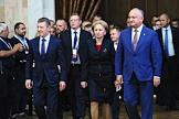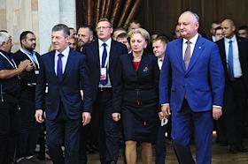 Рабочая поездка заместителя председателя Правительства России, спецпредставителя президента России по развитию торгово-экономических отношений с Молдавией Дмитрия Козака в республику Молдова. Президент Молдавии Игорь Додон (справа), заместитель председателя Правительства России Дмитрий Козак (третий слева) и председатель парламента Республики Молдова Зинаида Гречаная (вторая справа) во время работы Молдо-российского экономического форума.