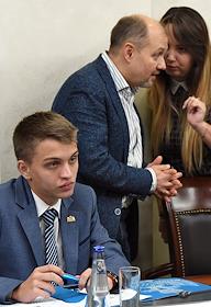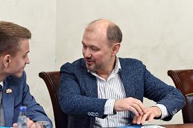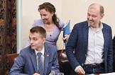 Первое заседание Экспертного совета по позитивному детскому контенту. Президент общенациональной программы "В кругу семьи" Александр Ковтунец (в центре) и ученик МБОУ "Средняя образовательная школа № 4" (г. Иваново), член Детского общественного совета при Уполномоченном по правам ребенка Ивановской области Ефим Смирнов (слева) перед началом заседания.