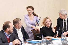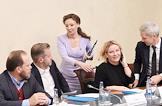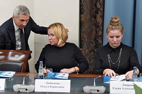 Первое заседание Экспертного совета по позитивному детскому контенту. Уполномоченный при президенте России по правам ребенка Анна Кузнецова (в центре), директор Департамента кинематографии Министерства культуры России Ольга Любимова (вторая справа) и заместитель председателя комитета Государственной думы России по культуре Александр Шолохов (слева) перед началом заседания.