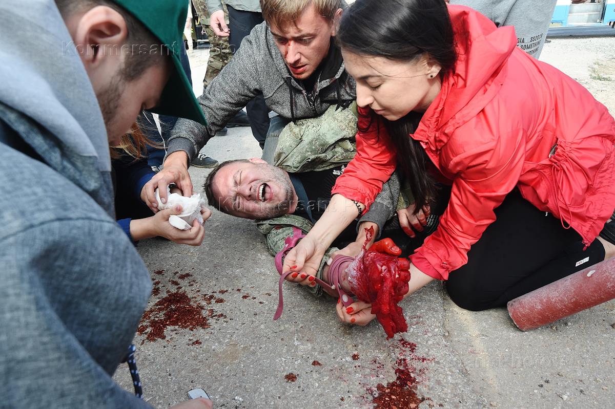 "Bastion" Special Training courses for representatives of the media and information agencies who work in high risk environments. Course participants during first aid in extreme conditions training.