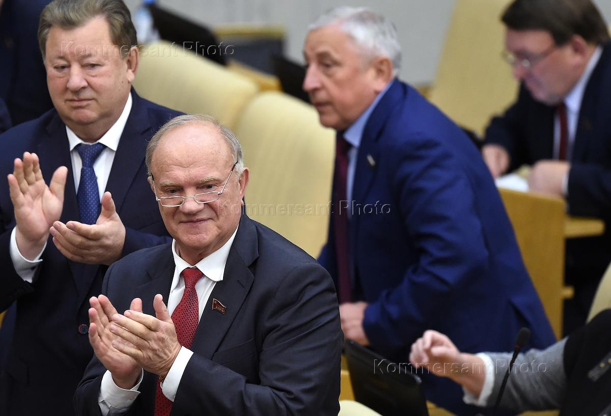 Пленарное заседание Государственной думы (ГД) России. Председатель комитета ГД России по аграрным вопросам Владимир Кашин (слева) и лидер КПРФ, член комитета ГД по делам Содружества Независимых Государств, евразийской интеграции и связям с соотечественниками Геннадий Зюганов (в центре) во время заседания.