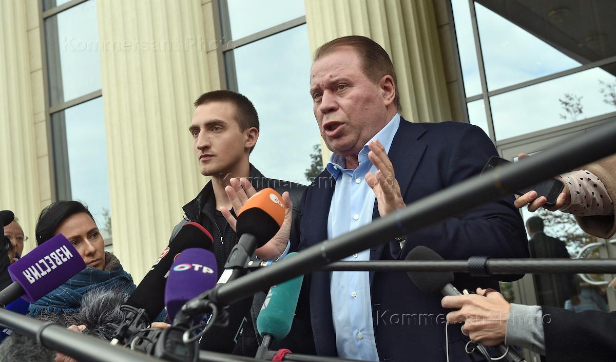 Actor Pavel Ustinov, left, accused of assaulting an officer of Russia's National Guard during an unauthorized rally on August 3, and lawer Anatoly Kucherena, right, after the appeal hearing in the Moscow City Court.