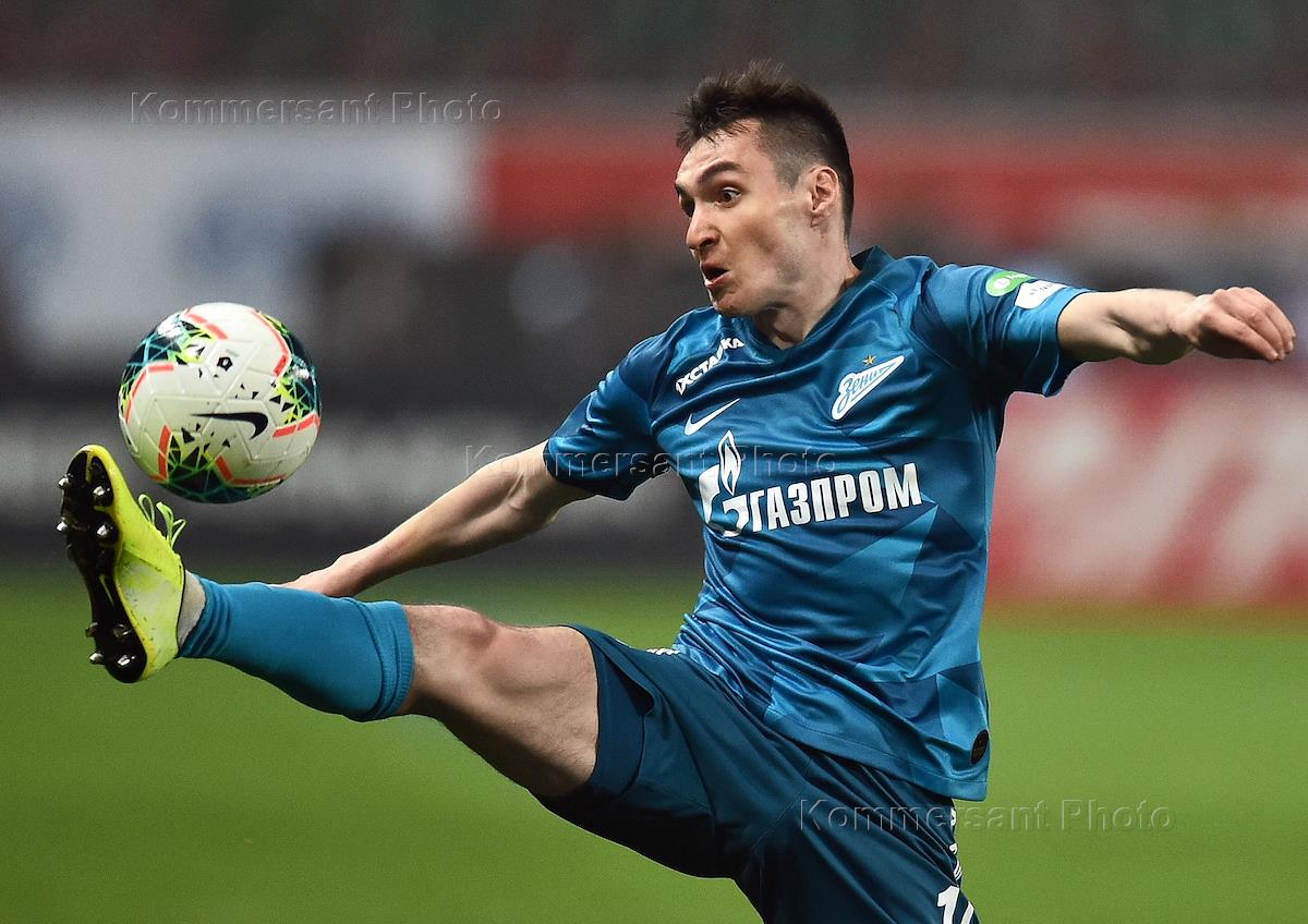 Российская Премьер-лига (РПЛ). Чемпионат России по футболу 2019/2020. 11-й тур. Матч между командами "Локомотив" (Москва) и "Зенит" (Санкт-Петербург) на стадионе "РЖД Арена". Игрок команды команды "Зенит" Вячеслав Караваев во время матча.