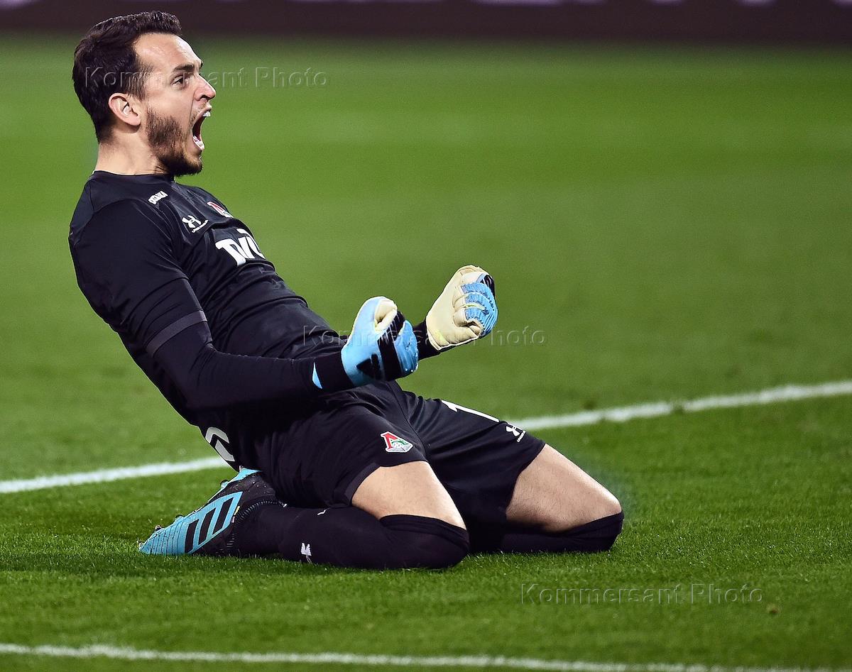 Российская Премьер-лига (РПЛ). Чемпионат России по футболу 2019/2020. 11-й тур. Матч между командами "Локомотив" (Москва) и "Зенит" (Санкт-Петербург) на стадионе "РЖД Арена". Вратарь команды команды "Локомотив" Маринато Гилерме во время матча.