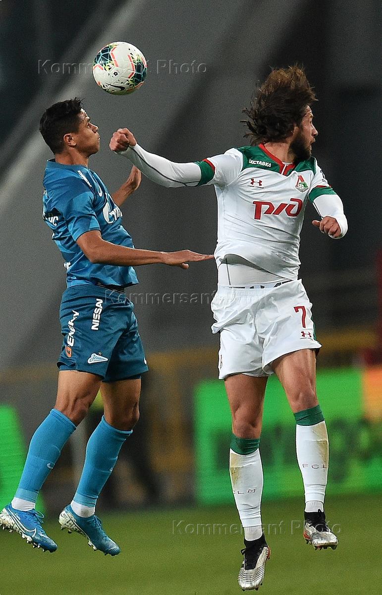 Russian Premier League (RPL). Russian Football Championship 2019/2020. 11h round. Match between Lokomotiv (Moscow) and Zenit (St. Petersburg) was held at the RZD Arena stadium. Lokomotiv's Rifat Zhemaletdinov, left, and Zenit's Wilmar Barrios, right, during the match.