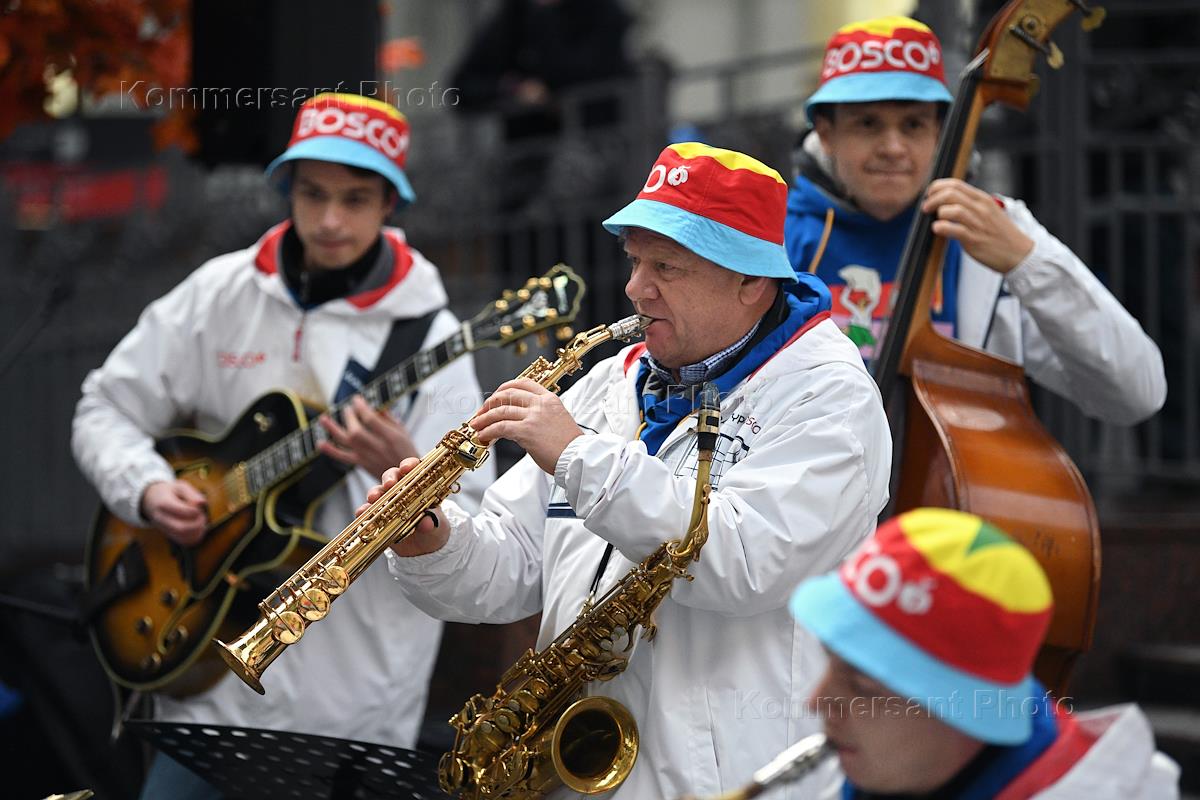 Opening of the "Bosco Manufactory" manufacturing complex in Kaluga. Jazzman Igor Butman (center) at Kiev Station before the departure of a train to Kaluga.