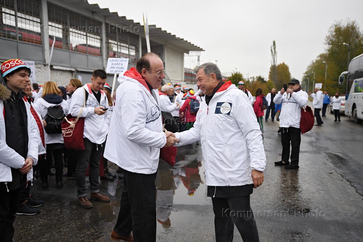 Opening of the "Bosco Manufactory" manufacturing complex in Kaluga. Chairman of the Supervisory Board of Bosco di Ciliegi Mikhail Kusnirovich (left) and Governor of the Kaluga Region Anatoly Artamonov (second from right) before the departure of a train to Kaluga.