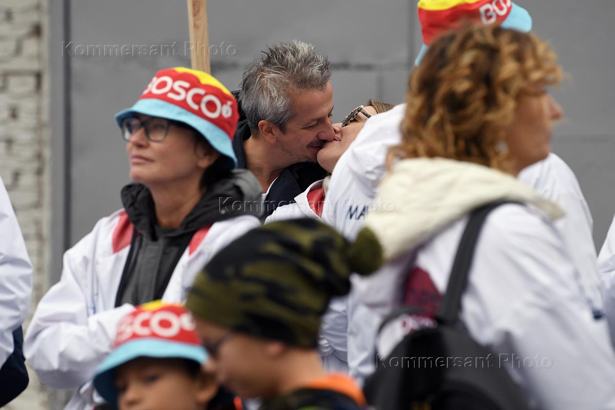 Церемония открытия производственного комплекса "Мануфактуры Боско" в Калуге. Журналист, телеведущая, основатель Фонда развития моды Москвы Ксения Собчак (вторая слева) и певец Валерий Сюткин (второй справа) перед началом церемонии.